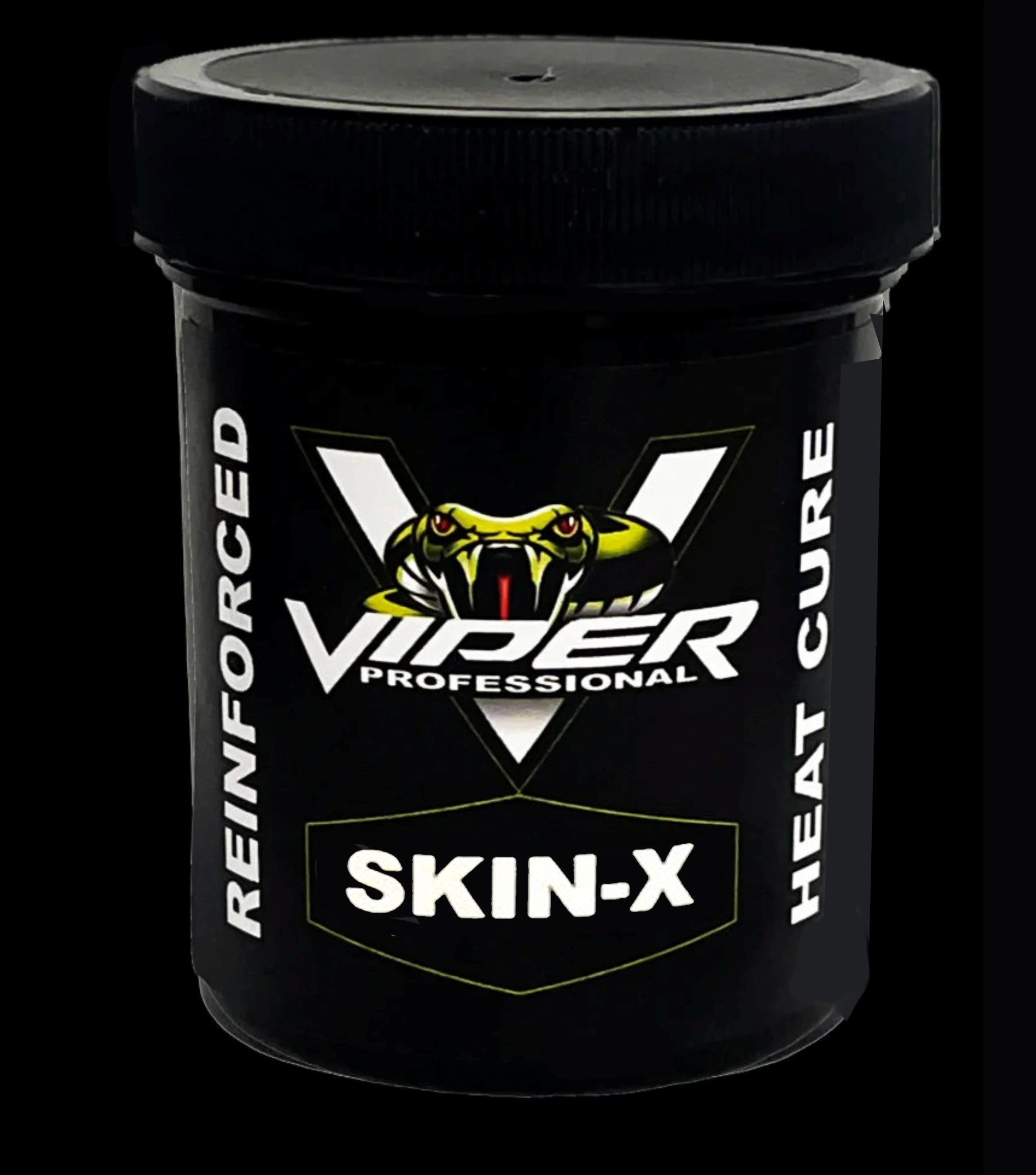 Skin - X is a next generation Very thin skin low temp low gloss heat cure compound designed by viper to give out standing performance on synthetic ,vinyl and leather It feature next generation heat cure adhesive for adhesion to tough materals that allows Skin-x to stick where oter compounds just peel off. This product produces an very thin skin layer that allow yuo to grain the repair without adding volume excellent for thin skin vinyls Try Skin -X and see the differeance.